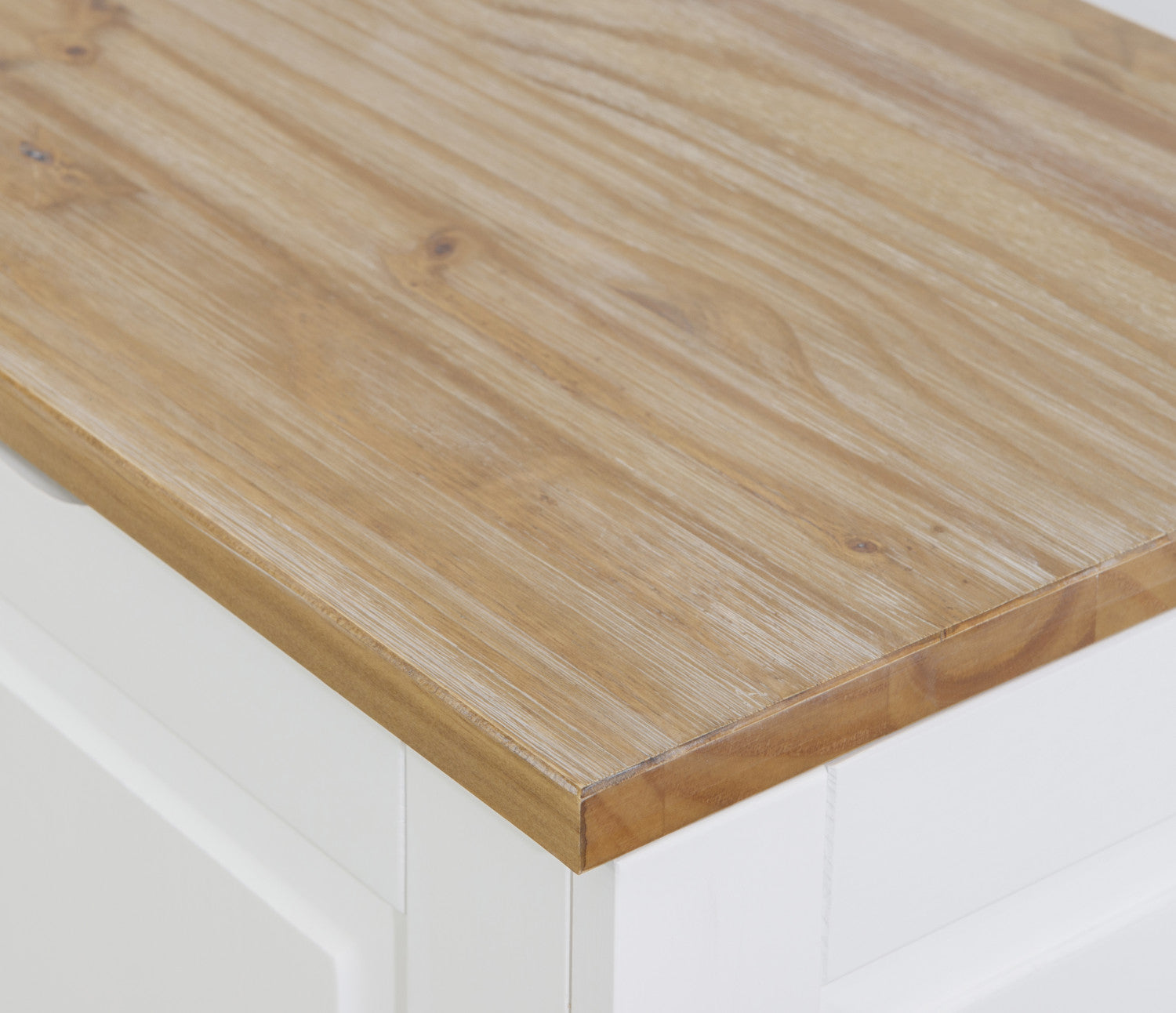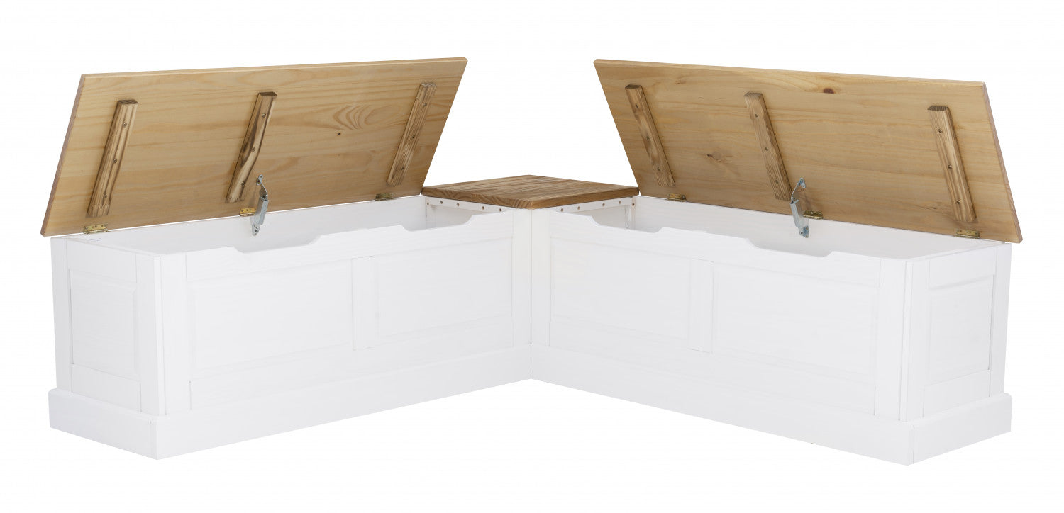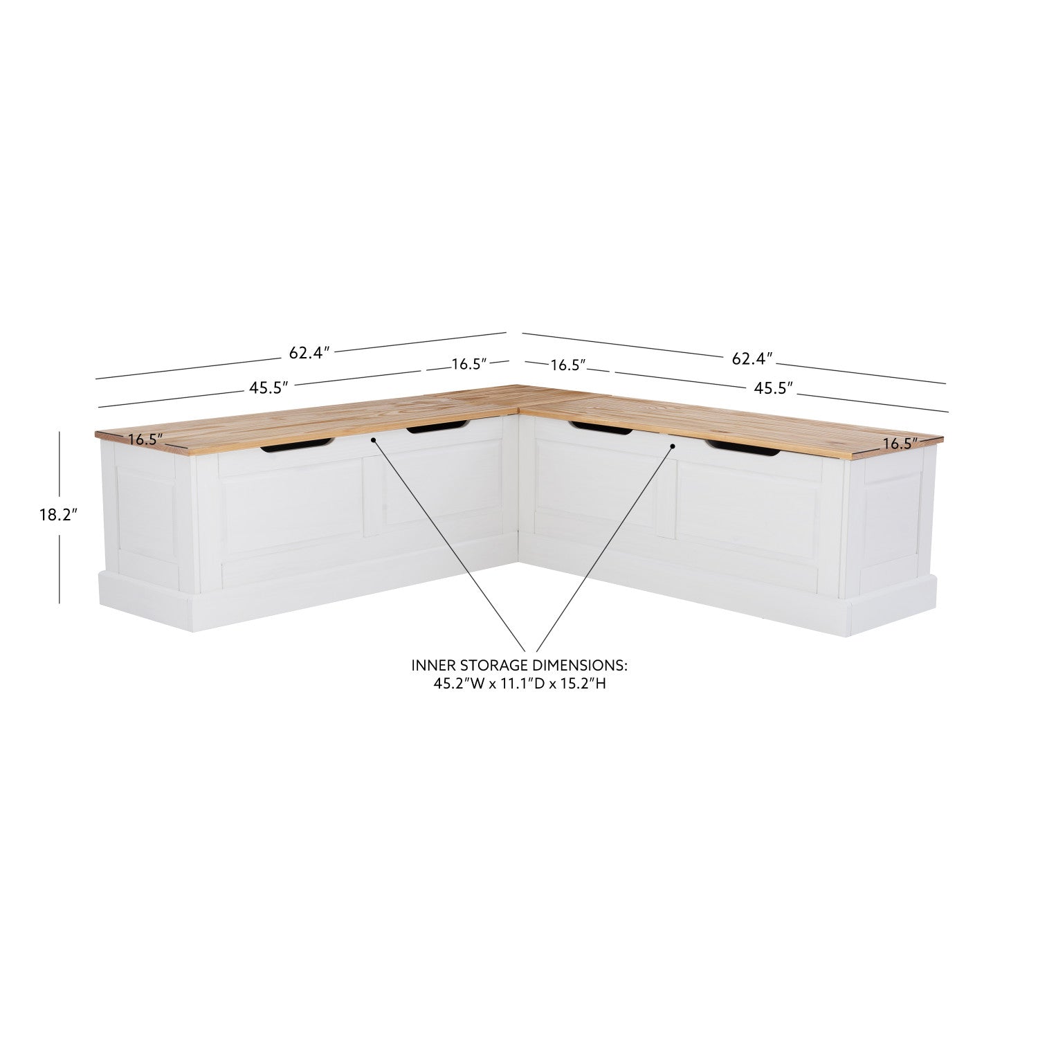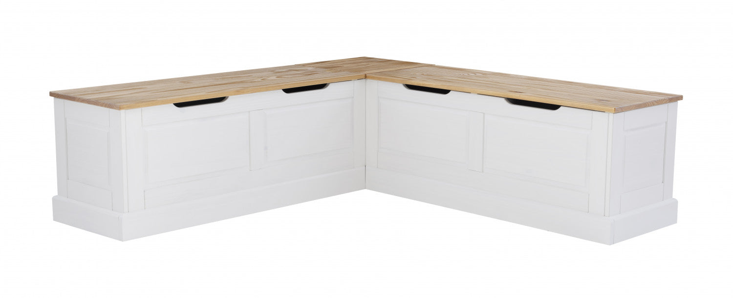 This breakfast nook creates the perfect place to relax with a cup of coffee or gather with friends over lunch. Cottage and farmhouse style will complement any round, rectangle, or square table you would like to pair it with. Backless to provide ultimate flexibility with its surroundings, this two-tone piece offers the look of built-ins without the cost or hassle. The natural solid pine seats open up to reveal hidden storage for extra placemats or seasonal decorations. Conveniently comes in one box. Cushions not included.