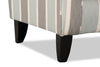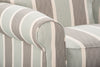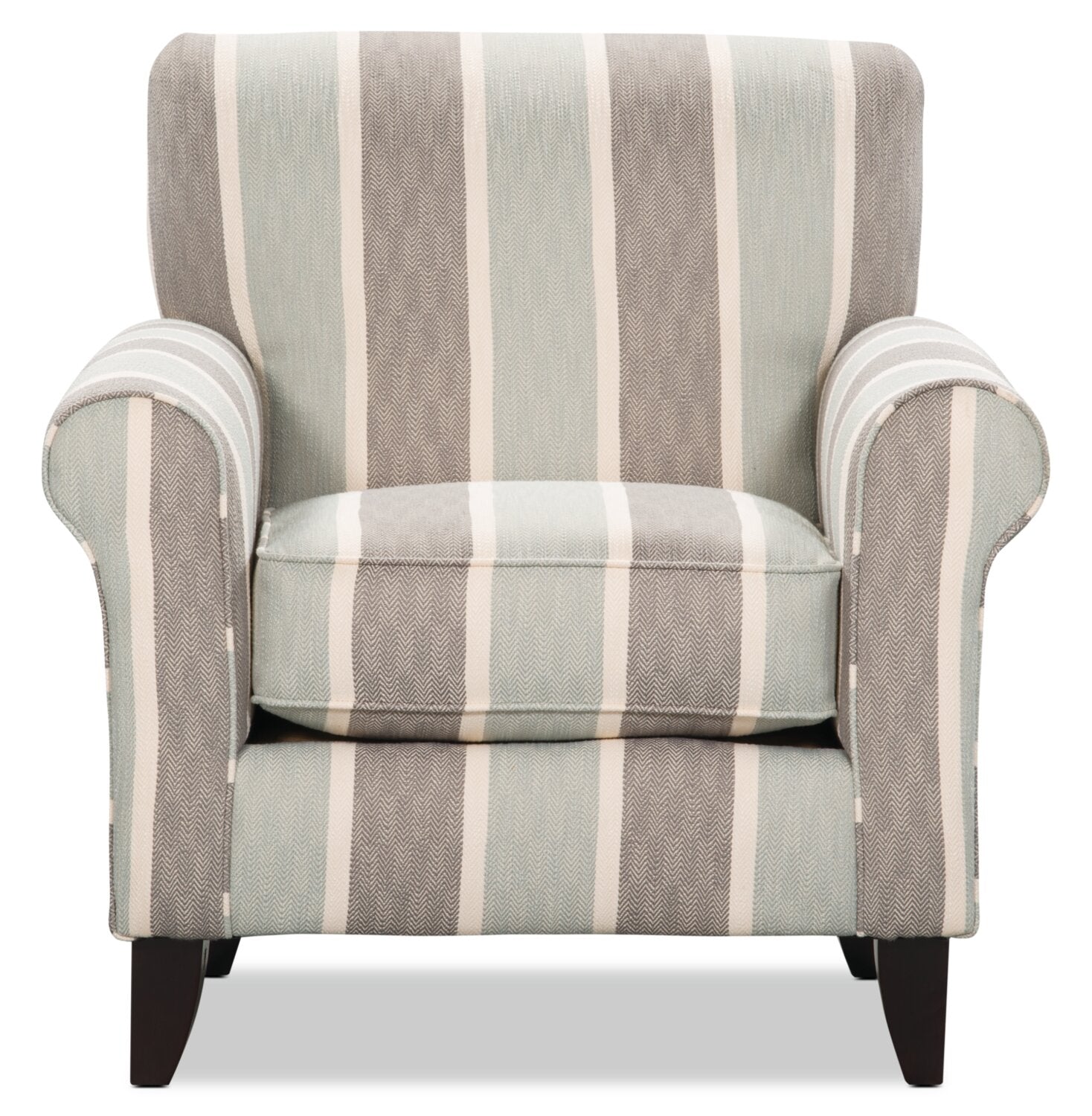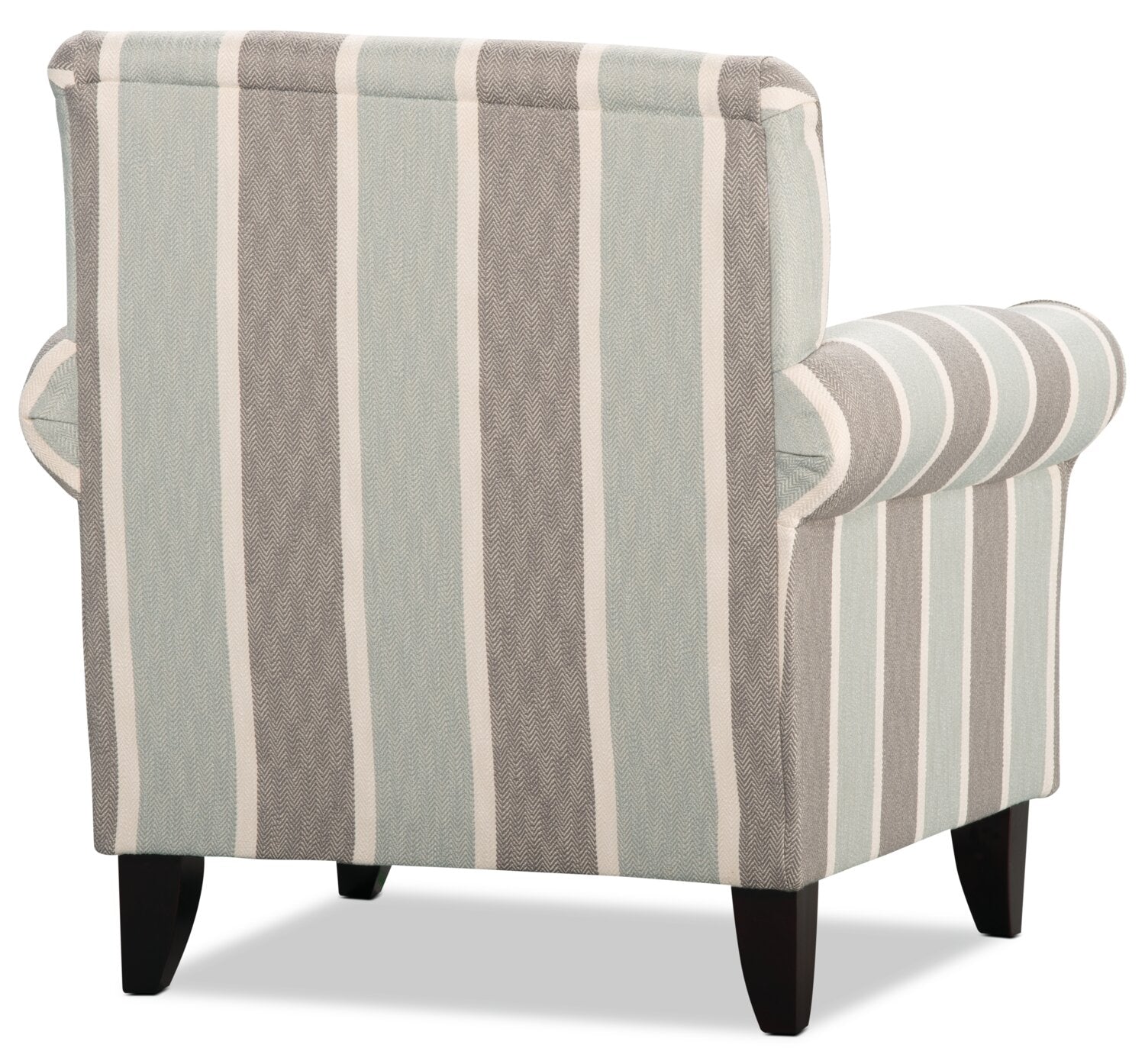Turn your living space into a comforting and inviting area by adding this striped Tula accent chair. Thick lines of light blue, grey and off-white cover this piece for a classic look you can pair with many different decor options. Plus, matching fabric piping outlines all the edges – including the rolled armrests. The thick seat cushion is packed with high-density foam to give you a cozy place to unwind. With plastic legs finished in a mocha hue, this Tula accent chair will amaze your family and friends with its elegance.