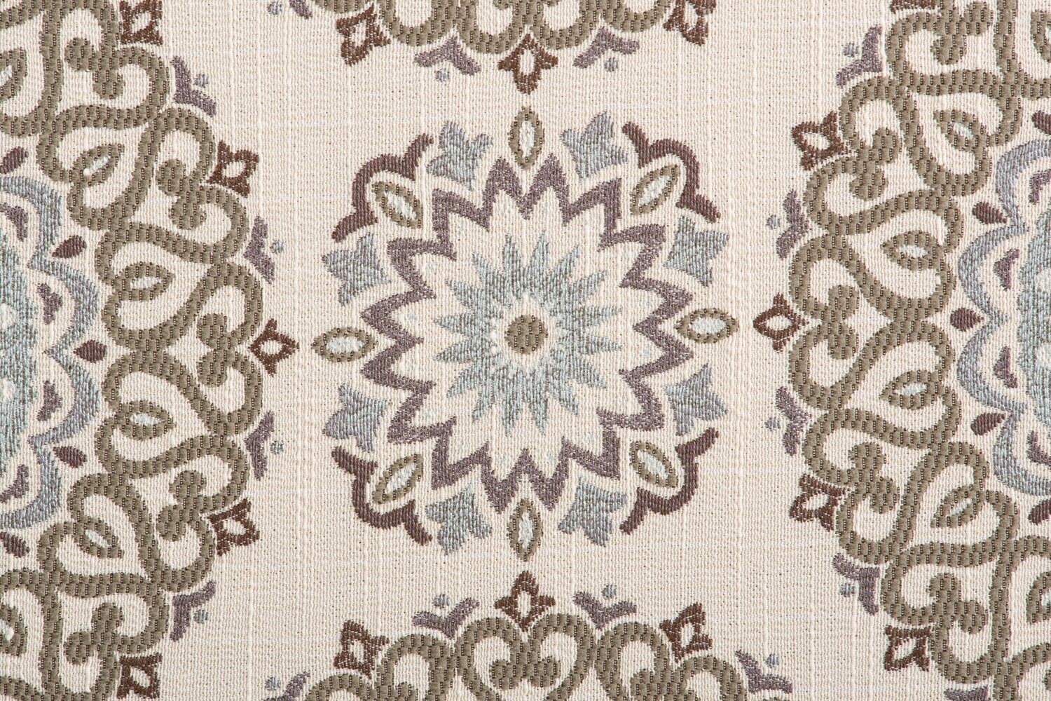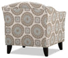 Turn your living space into a comforting and inviting area by adding this refined Tula accent chair. Patterned blue and grey circles cover this off-white piece for a contemporary look you can pair with many different decor options. Plus, matching fabric piping outlines all the edges – including the rolled armrests. The thick seat cushion is packed with high-density foam to give you a cozy place to unwind. With plastic legs finished in a mocha hue, this Tula accent chair will amaze your family and friends with its elegance.