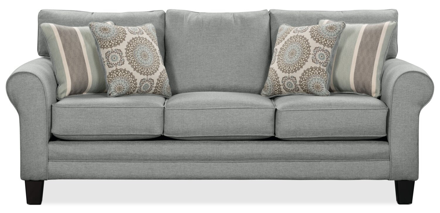 Turn your living space into a comforting and inviting area by adding this mist-coloured Tula sofa. Soft fabric covers the couch in light blue for a classic look you can pair with many different decor options. Plus, matching fabric piping outlines all the edges – including the rolled armrests. Each of the seat cushions are packed with high-density foam to give you a cozy place to unwind. With four accent pillows for a touch of flair, this Tula sofa will amaze your family and friends with its elegance.