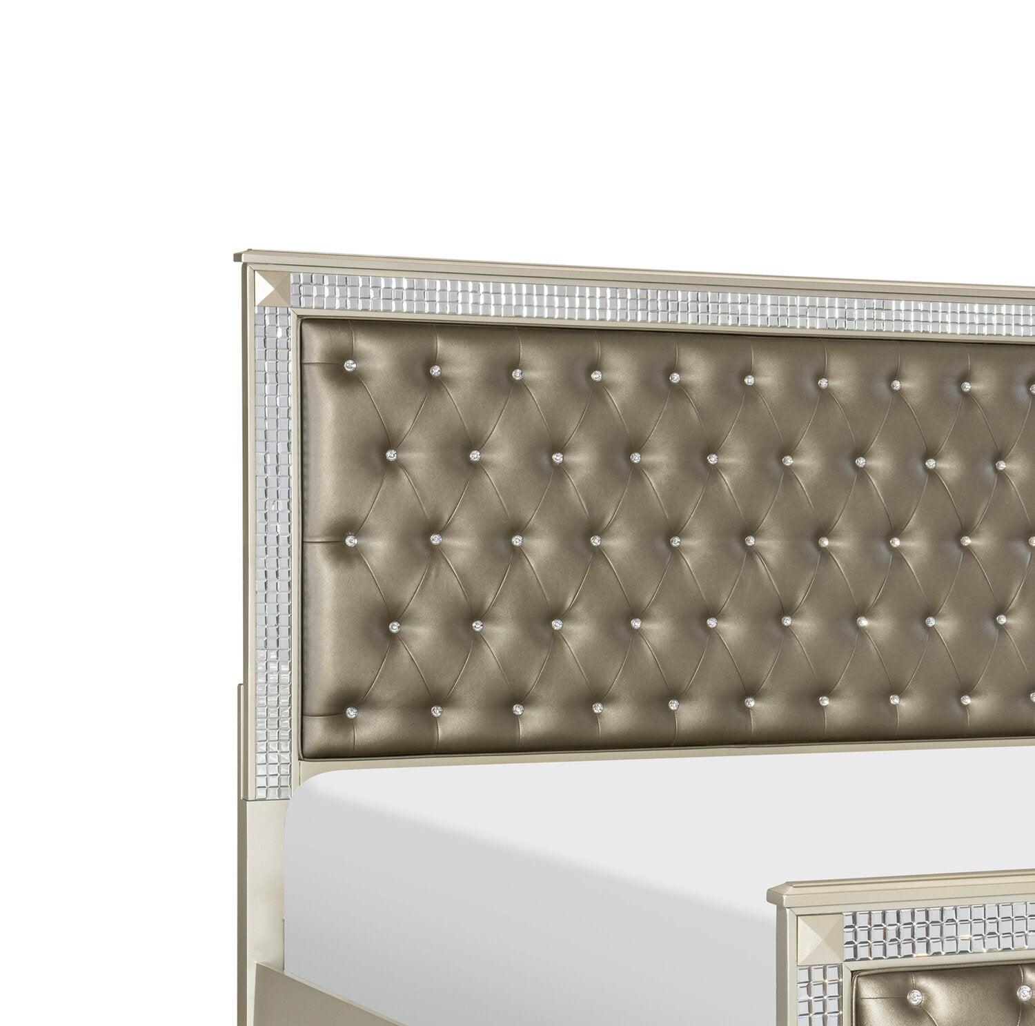 Tyra Panel Bed with Headboard & Frame, Glam, Vegan Leather, Button-Tufted, Champagne - Queen Size