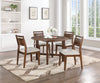 Elevate your dining experience with this sophisticated Vale five-piece round dining set. Its sleek appearance and minimalist design bring an elegance that effortlessly boosts its surrounding setting. Featuring a shiny dark brown finish and beige upholstered seat cushions, this set is sure to turn heads. With padded seats, angled backs, and the mango wood frame’s unique colouration, this set will enhance late-night dinner parties and big family meals. From its sturdy construction to its eye-catching appearance, the Vale is sure to be embraced as a favourite amongst friends and family.
