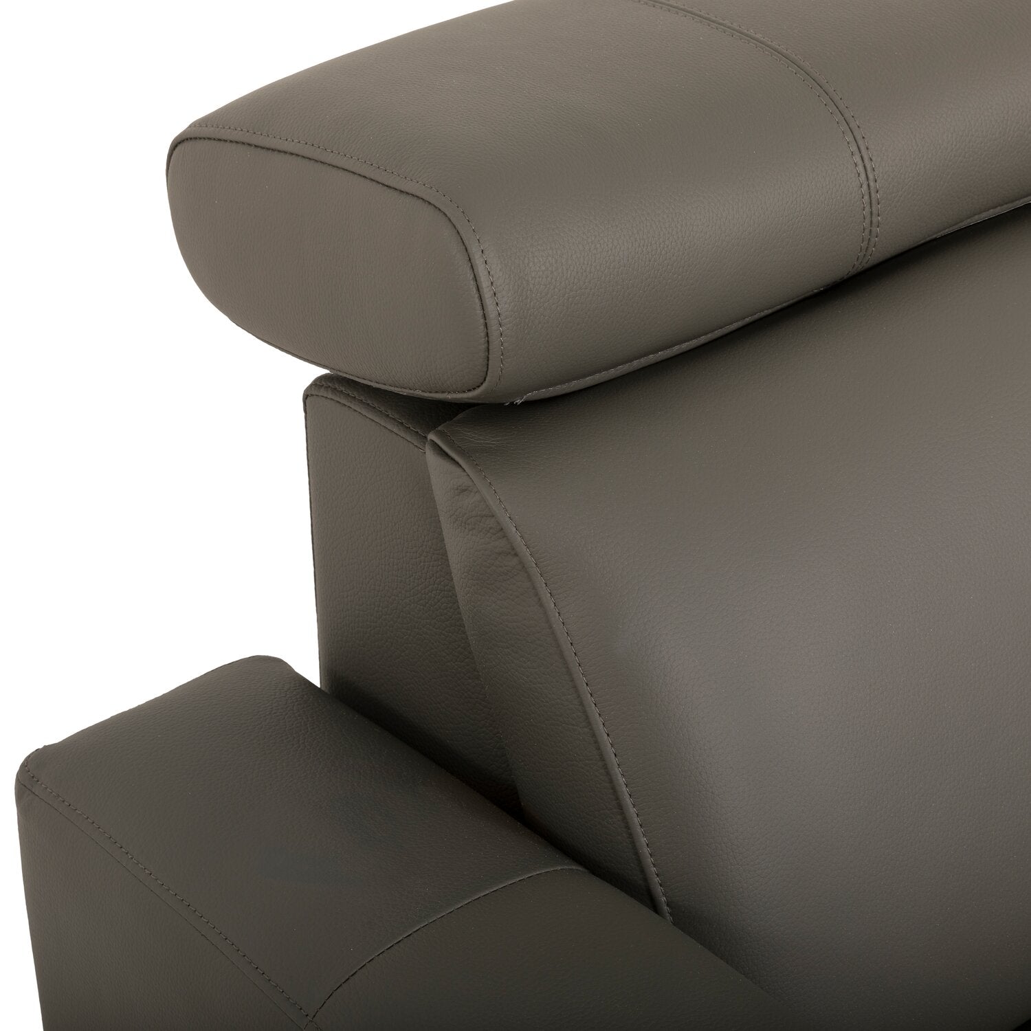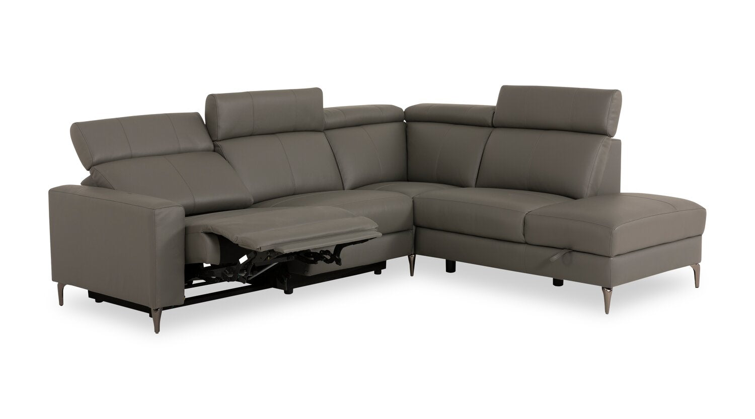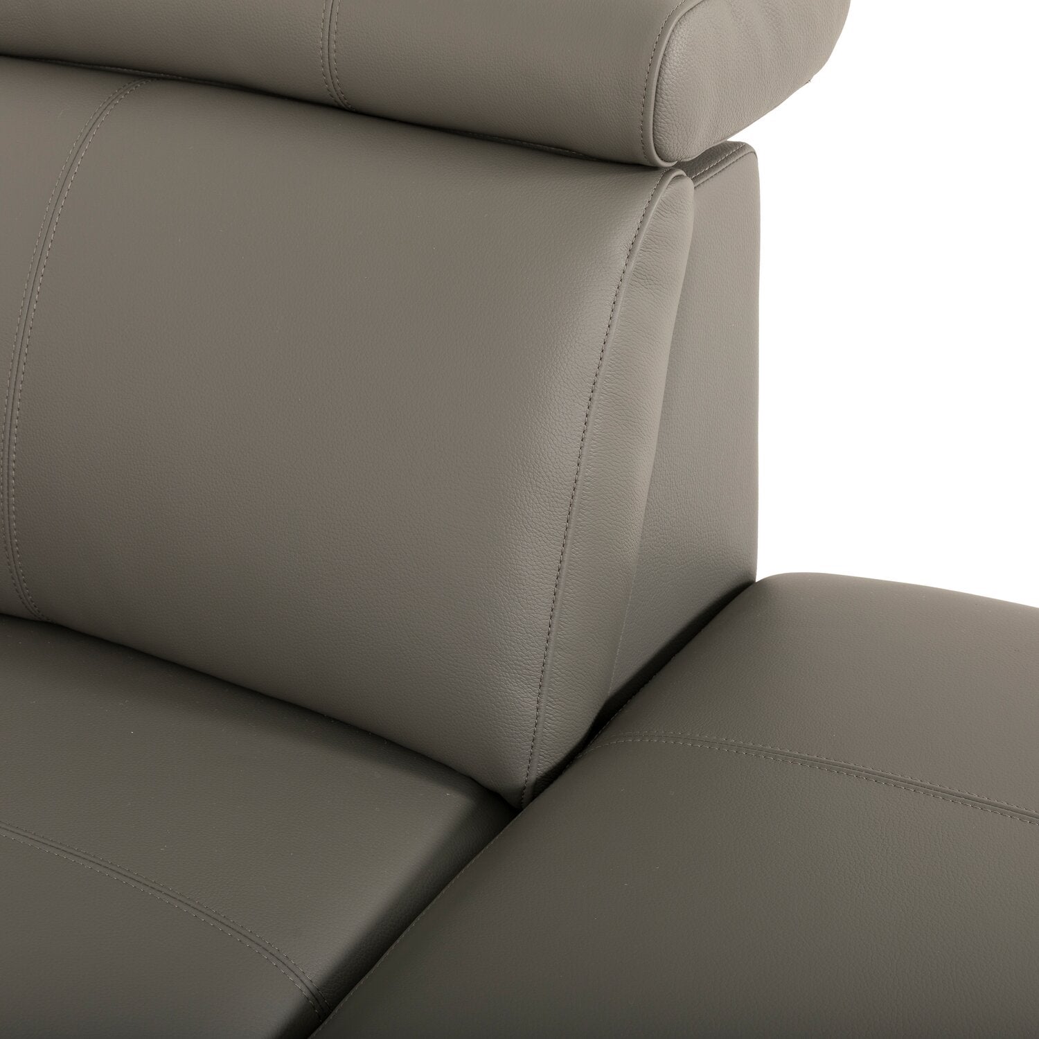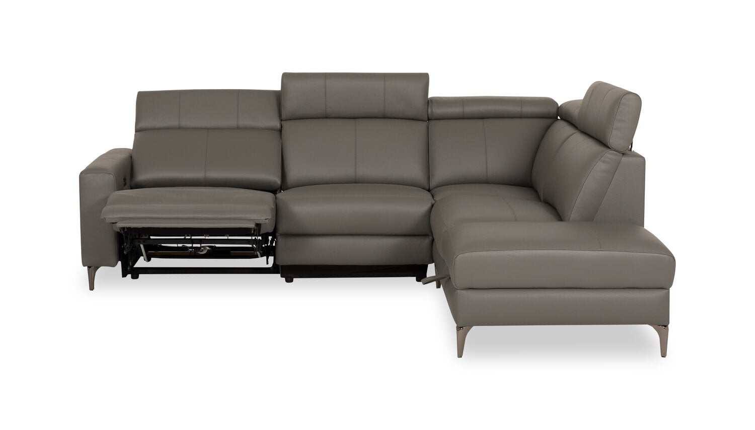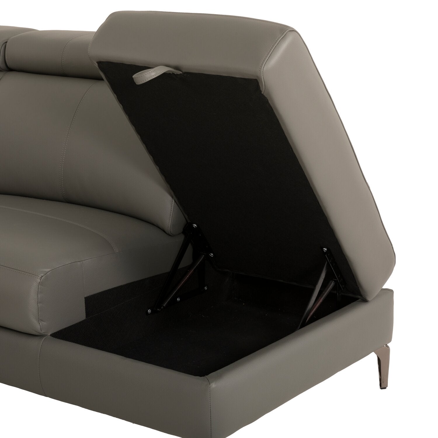 | Accent Details | Metal legs support this piece in subtle style, pairing well with the smooth grey genuine leather upholstery. |