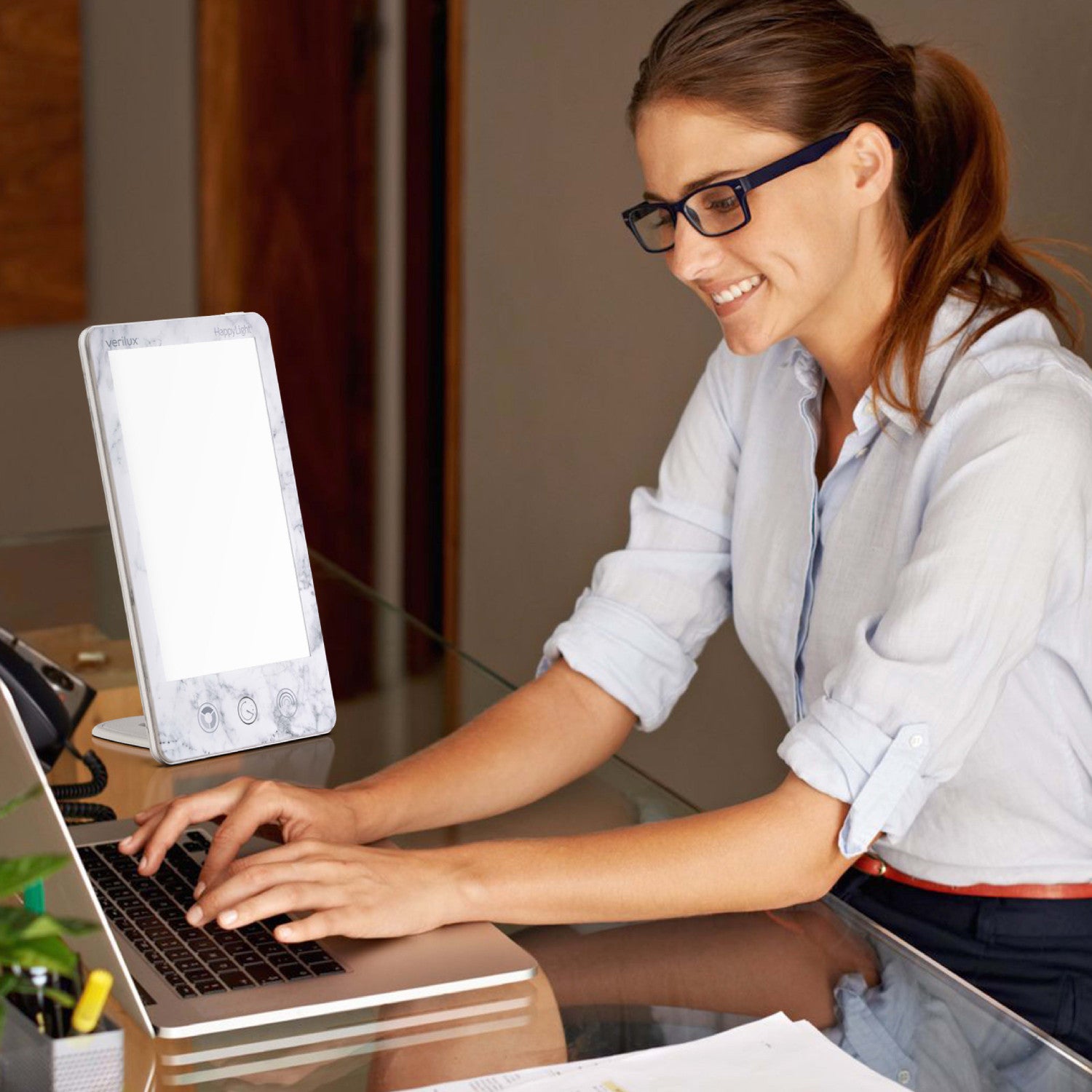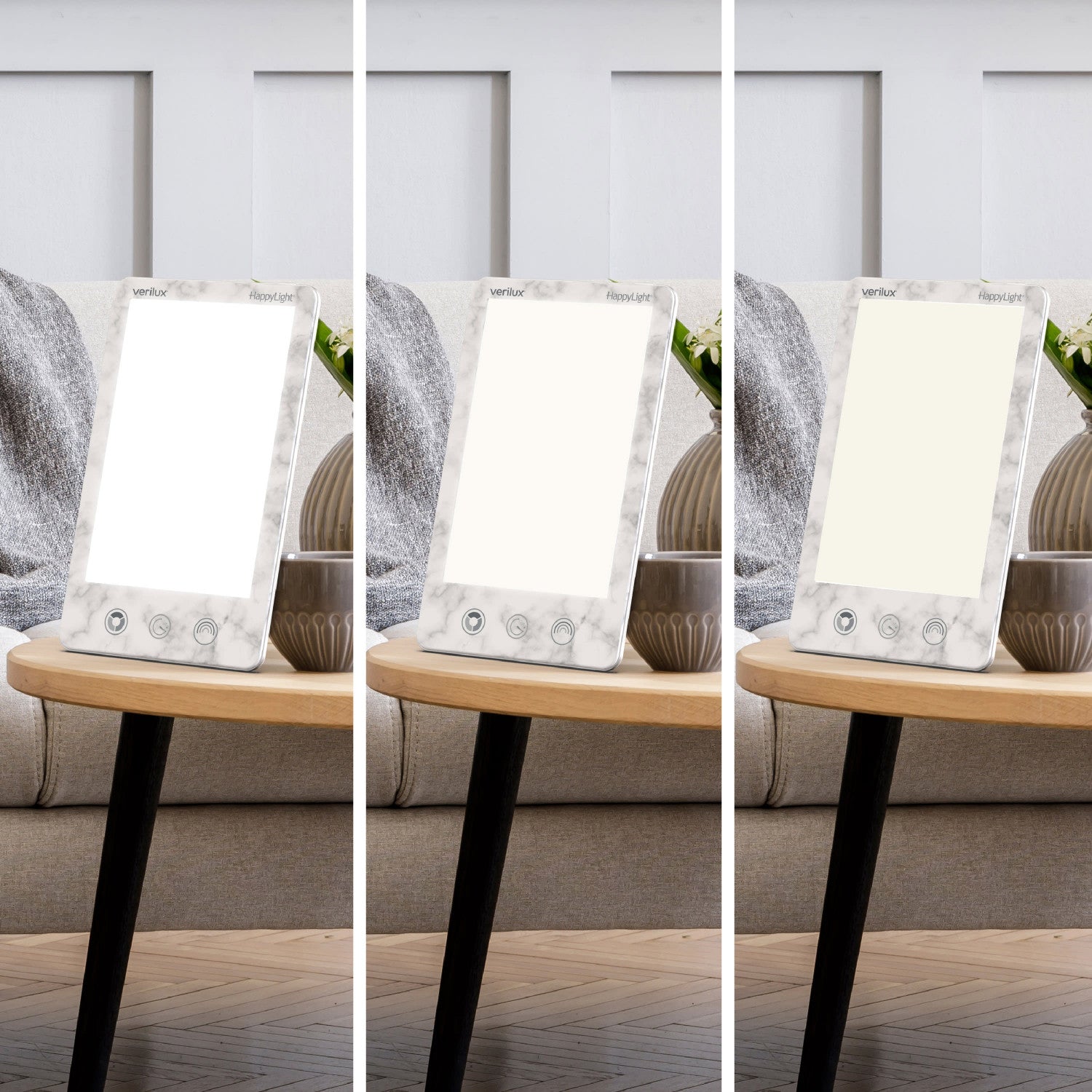 Introducing the new HappyLight® Luxe light therapy lamp by Verilux - featuring adjustable colour, temperature and a countdown timer that allow you to personalize your experience. The slim travel-friendly design is great for easy packing while a detachable stand allows you to use your HappyLight® Luxe wherever you need it, or mount it on the wall in a convenient spot for your daily light therapy routine. Plug it in and get happy.