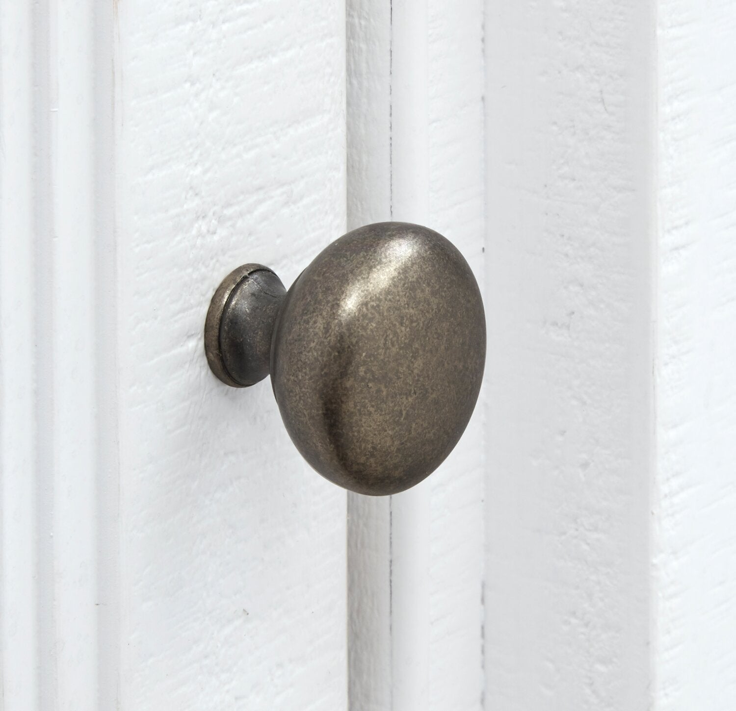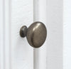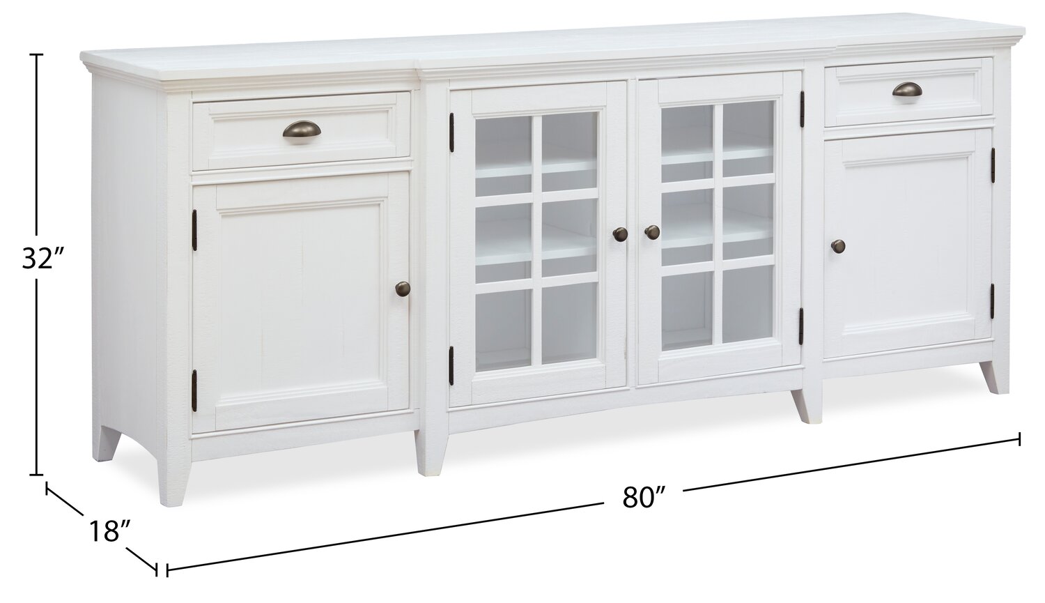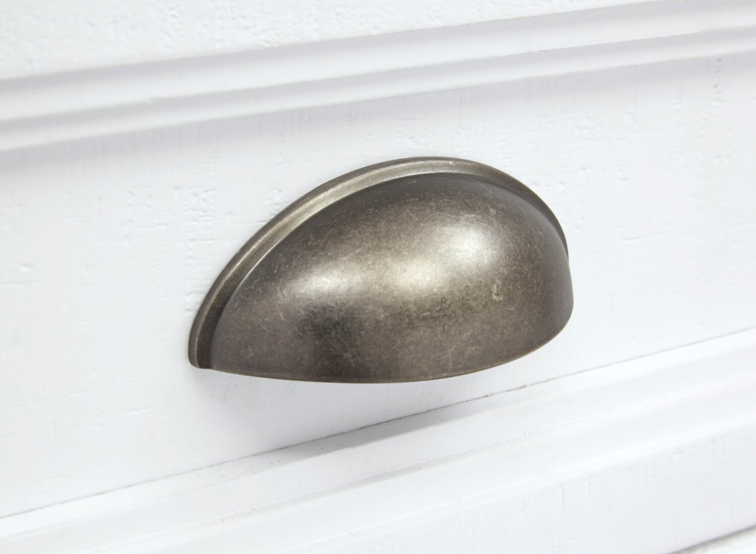 | Hardware | Aged pewter drawer cup handles and cabinet doorknobs. |