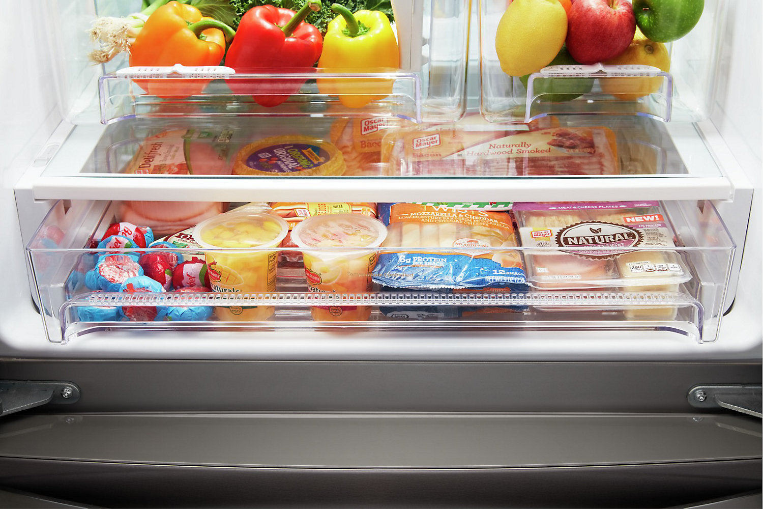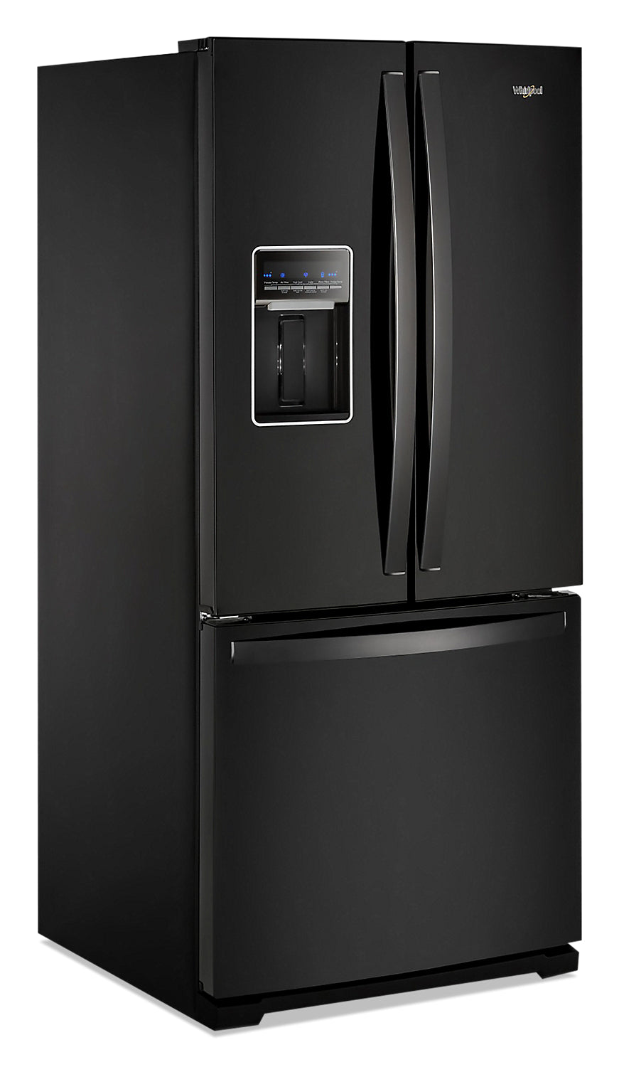 In this 20-cubic-foot Whirlpool wide French-door refrigerator you will find unique storage areas designed with you and your family in mind, with plenty of room for the goods you use the most. Use the condiment caddy for easy access to all of your favourite toppings and sauces, or pour yourself a fresh glass of filtered ice water from the exterior water dispenser. The humidity-controlled crispers and FreshFlow™ produce preserver allow your fruits and veggies to stay fresher longer, while the adjustable gallon door bins add loading flexibility when and where your family needs it.