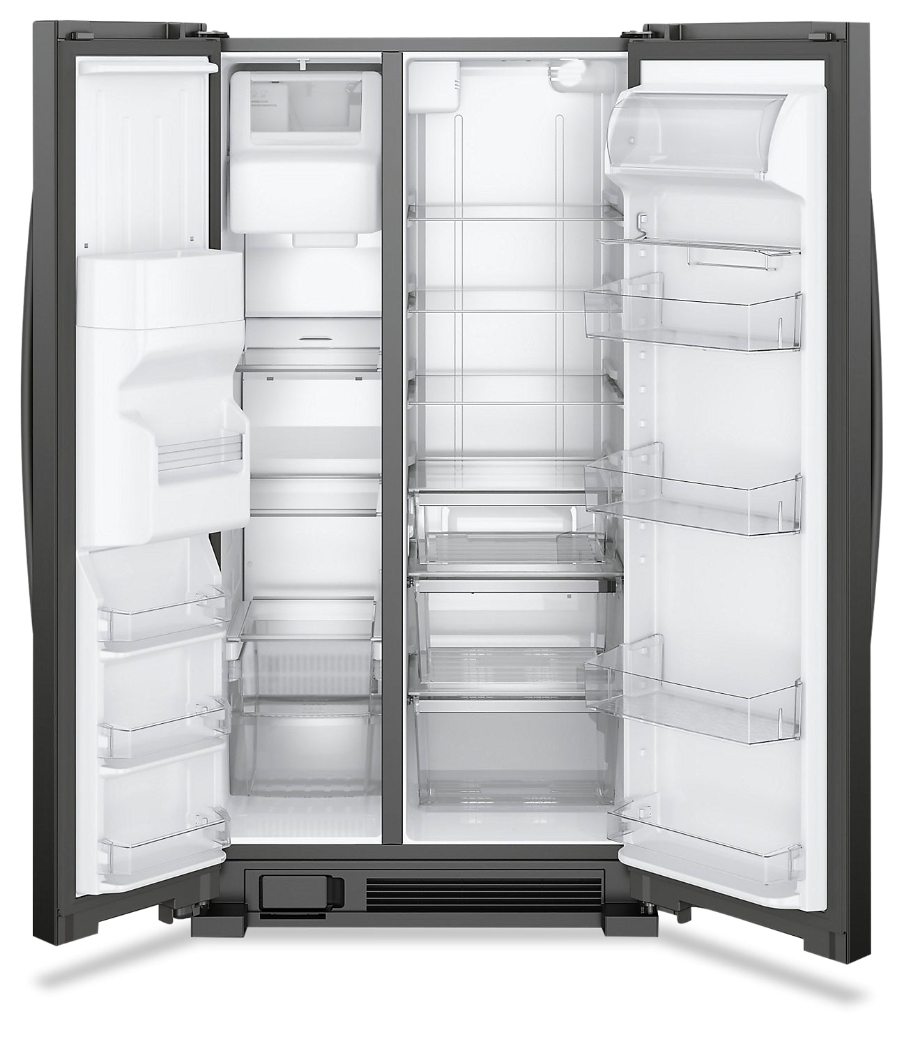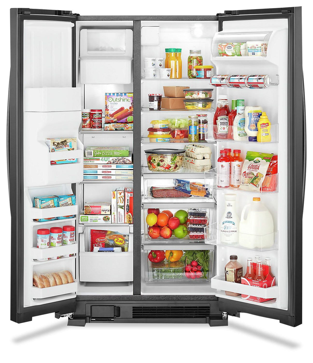Fit and find everything you need in this side-by-side 25-cubic-foot Whirlpool refrigerator, with purposefully created storage spaces for the items you and your family use the most. This spacious fridge is home to specially-designed, wall-to-wall shelves and door bins that give you flexibility for wide and tall items. Rely on the exterior ice and water filter for a refreshing drink anytime, even in the dark with the built-in nightlight. This fridge also features humidity-controlled crispers and adaptive defrost to ensure all of your food, fresh or frozen, lasts.
