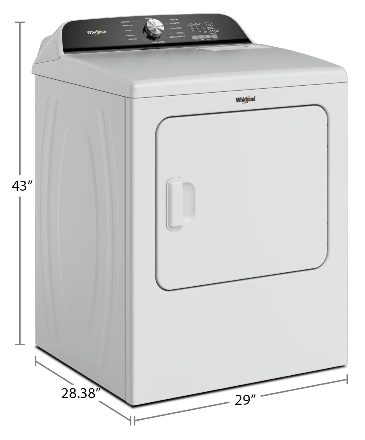 | Dry Cycles | Regular Less Dry, Regular Normal Dry, Regular More Dry, Heavy Duty, Bulky Items, Delicates, Whites, Wrinkle Control, Quick Dry, Towels/Sheets, Timed Dry, Steam Refresh |