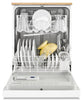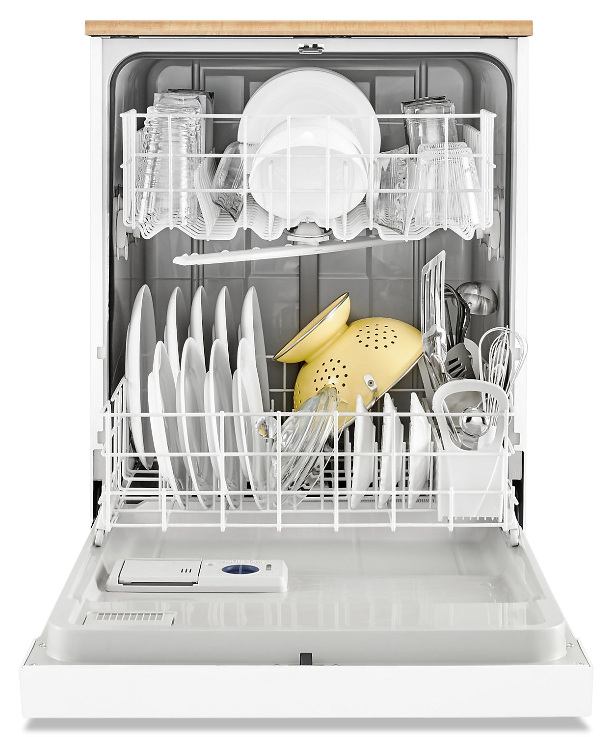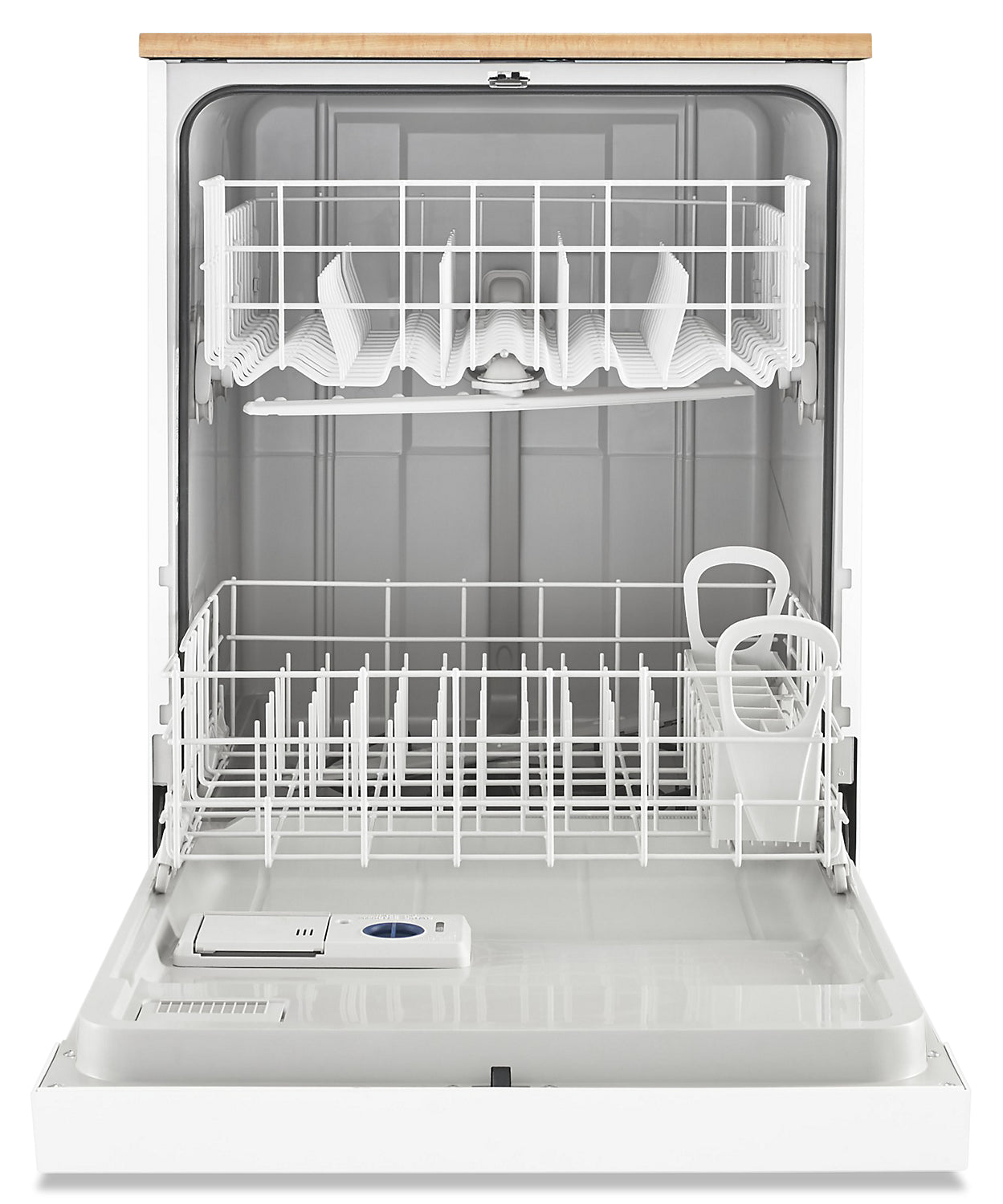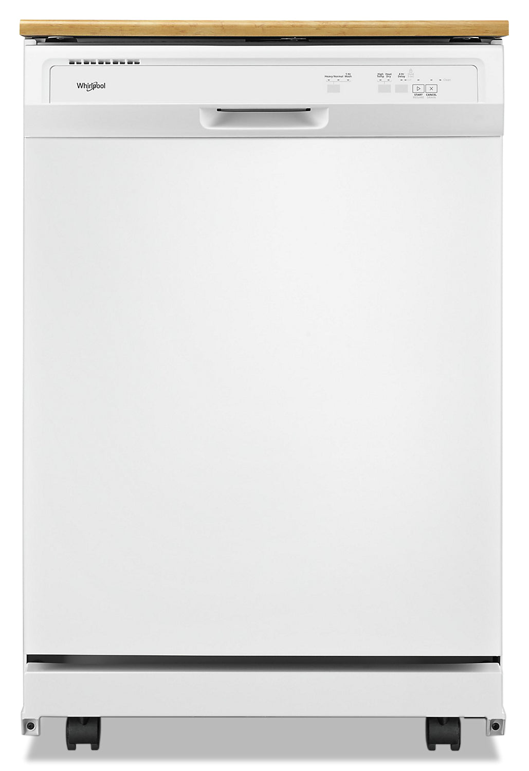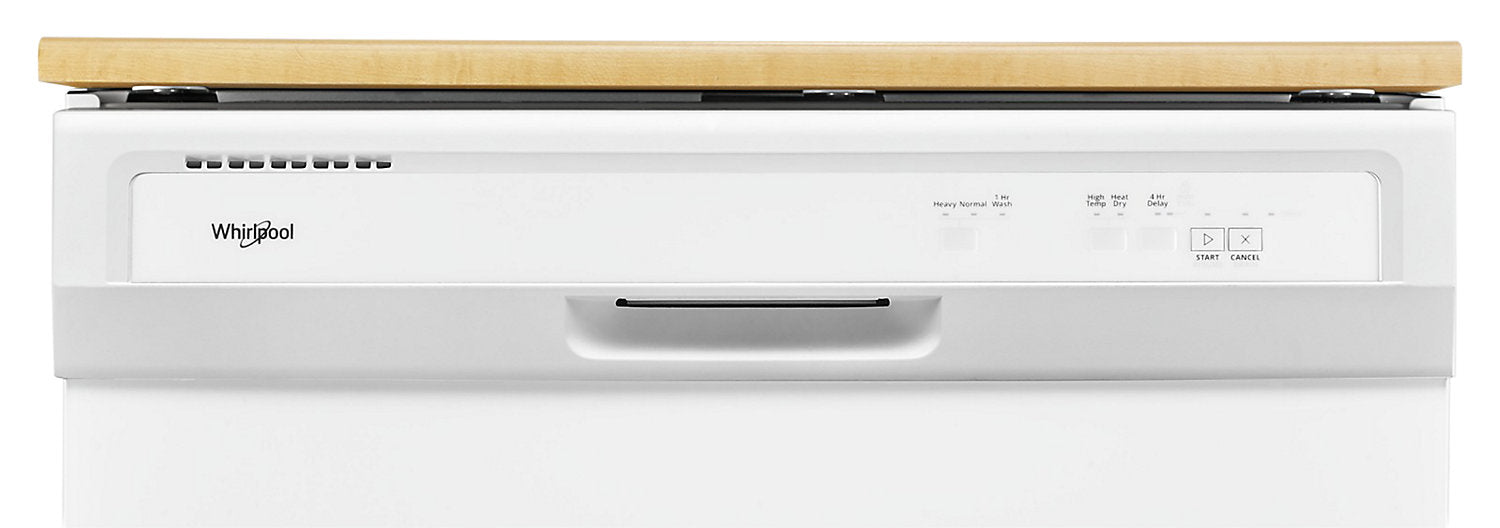 Get a thorough clean for your dishes even in a small condo, apartment or dorm with this Whirlpool heavy-duty portable dishwasher. The work surface on top of this appliance creates extra counter space for your cooking and cleaning needs, and four casters allows you to move the dishwasher out of the way when it’s not in use. Cut chore-time in half by using the 1-hour wash cycle which lets you finish any cleaning job in a hurry. Plus, rely on the soil sensor to automatically adjust to the soil levels of your dishes for a more thorough clean.