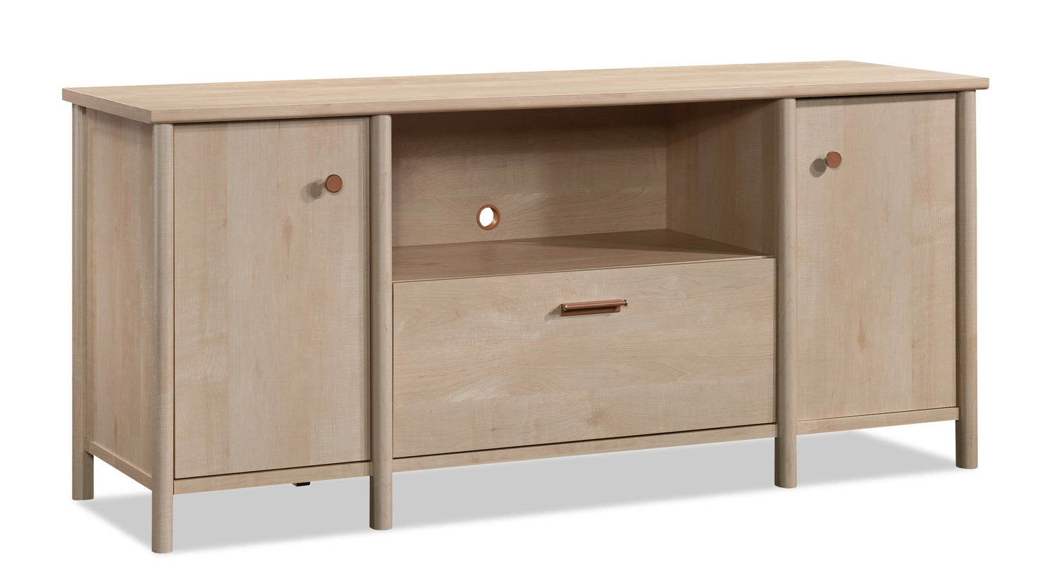 Find motivation and more when you add style and storage to your home office with this Whitaker Point credenza. Featuring a file drawer that holds letter- or legal-size hanging files, your paper clutter will be kept at bay and organized. Behind each door is a large adjustable shelf for customizable storage options. Your binders, books, reports and more will be easily arranged and conveniently stored in this piece. A natural finish evokes a rustic and simpler time, giving you the focus needed to complete any task.