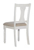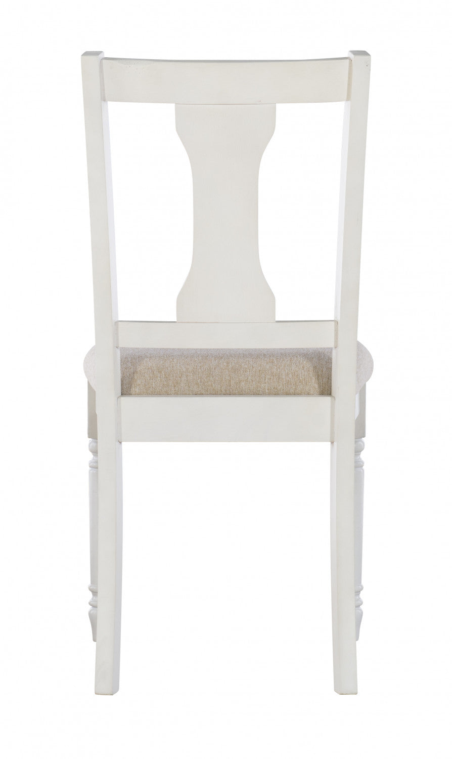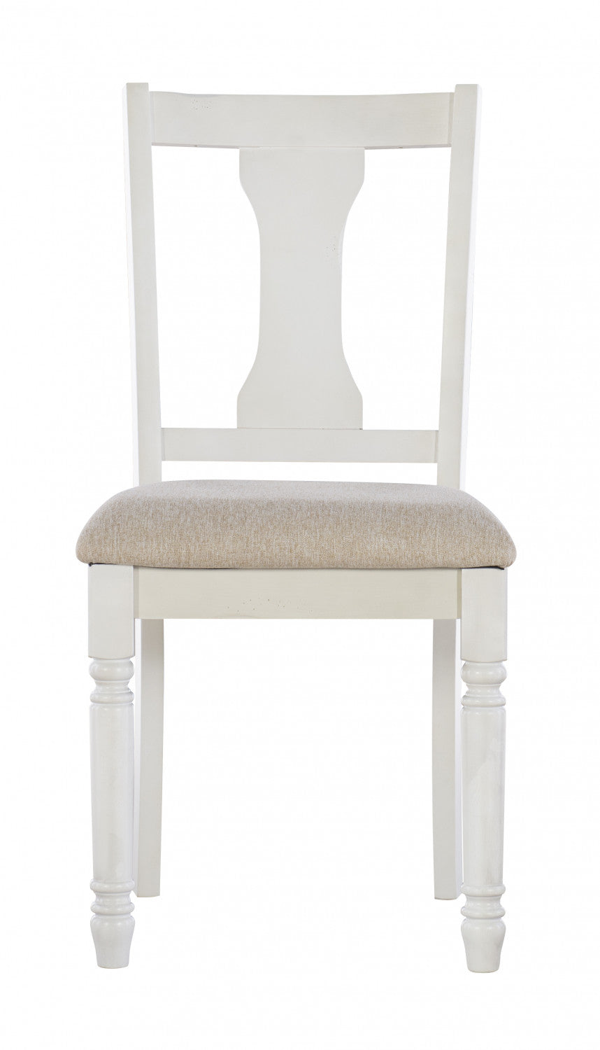 Pull up to the table with this hourglass back chair with comfortable, padded seat and a foundation of solid rubberwood. The light tan seat is upholstered with nice 'n clean® fabric, a performance material that withstands the everyday wear and tear that come with any busy kitchen. Everyday spills, including coffee, ketchup, salsa, and wine, clean up quickly maintaining the beauty of your investment. Sculpted, turned legs with a glaze finish add a farmhouse touch. Two chairs included with purchase.