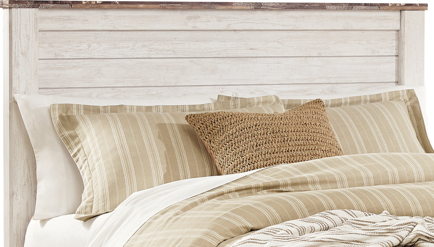 Take a trip to cottage country with this Willowton queen bed. That slowed-down, small town feeling is beautifully characterized through the whitewash finish and beaded frame. Through the uneven coating and rustic planks, you'll be able to spot the unique character of the woodgrain, providing you with a quaint, familiar look that has been stylish through the ages. The matching headboard and footboard add lovely lines and a two-toned look to this simple design. Altogether, you get a stylish bed that offers you a cozy retreat at the end of each day.