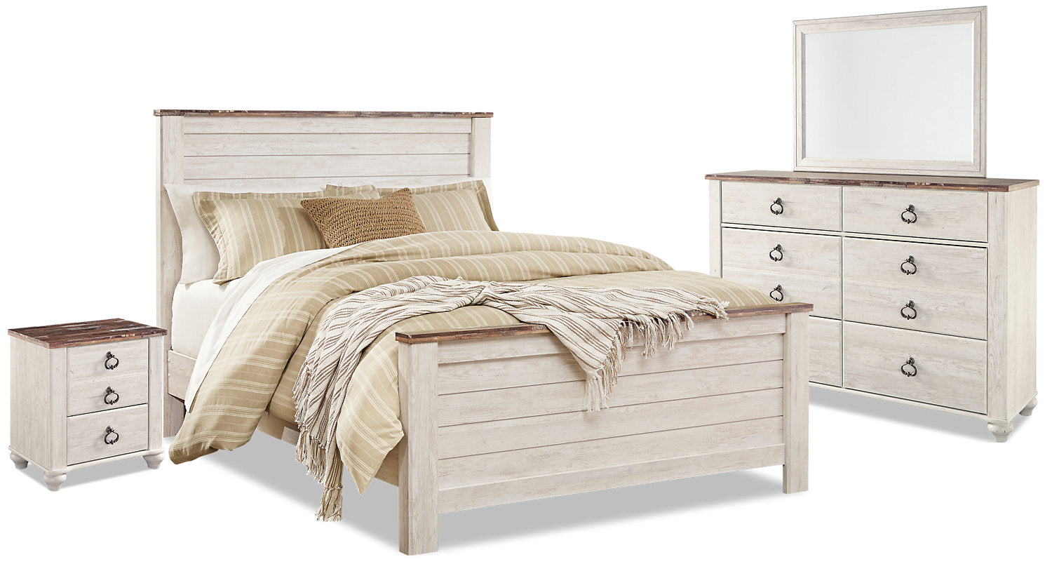 Take a trip to cottage country with this Willowton bedroom package. That easygoing feeling is beautifully characterized through the whitewash finish, moulded feet and knocker-style handles found throughout this set. Under the uneven coating you'll be able to spot the unique character of the woodgrain, providing you with a quaint and familiar look that has been stylish through the decades. Finally, the simple bed frame with two-tone, beaded paneling anchors this stylish look, while plentiful storage is available in the matching pieces.