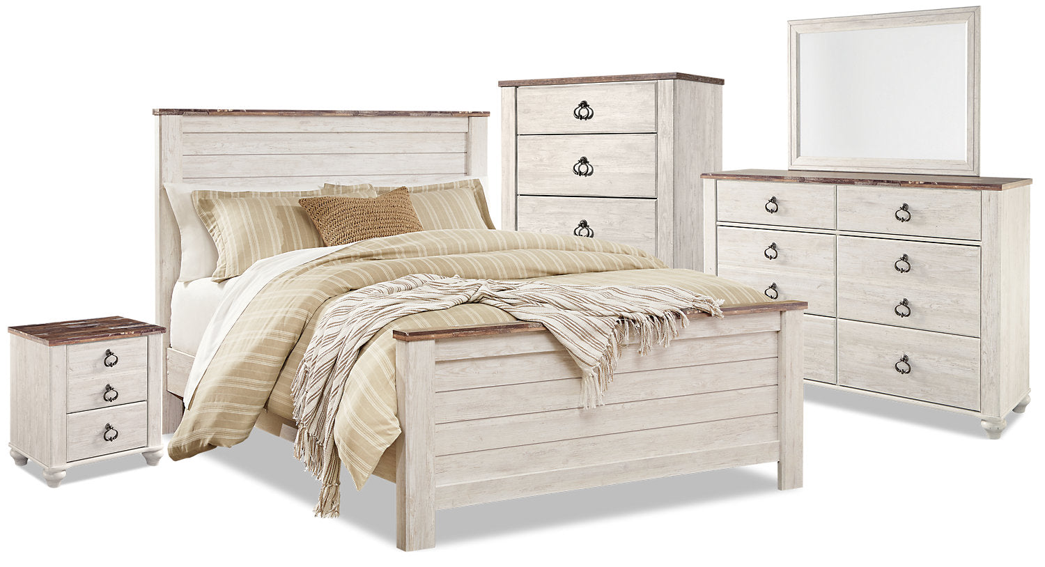 Take a trip to cottage country with this Willowton bedroom package. That easygoing feeling is beautifully characterized through the whitewash finish, moulded feet and knocker-style handles found throughout this set. Under the uneven coating you'll be able to spot the unique character of the woodgrain, providing you with a quaint and familiar look that has been stylish through the decades. Finally, the simple bed frame with two-tone, beaded paneling anchors this stylish look, while plentiful storage is available in the matching pieces.