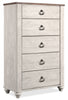 Take a trip to cottage country with this Willowton chest. That slowed-down, small town feeling is beautifully characterized through the whitewash finish, moulded feet and knocker-style handles. Through the uneven coating and faux plank top you'll be able to spot the unique character of the woodgrain, providing you with a quaint, familiar look that has been stylish through the ages. Altogether, you get a stylish chest that offers you five easy-glide drawers to store your bedroom essentials.