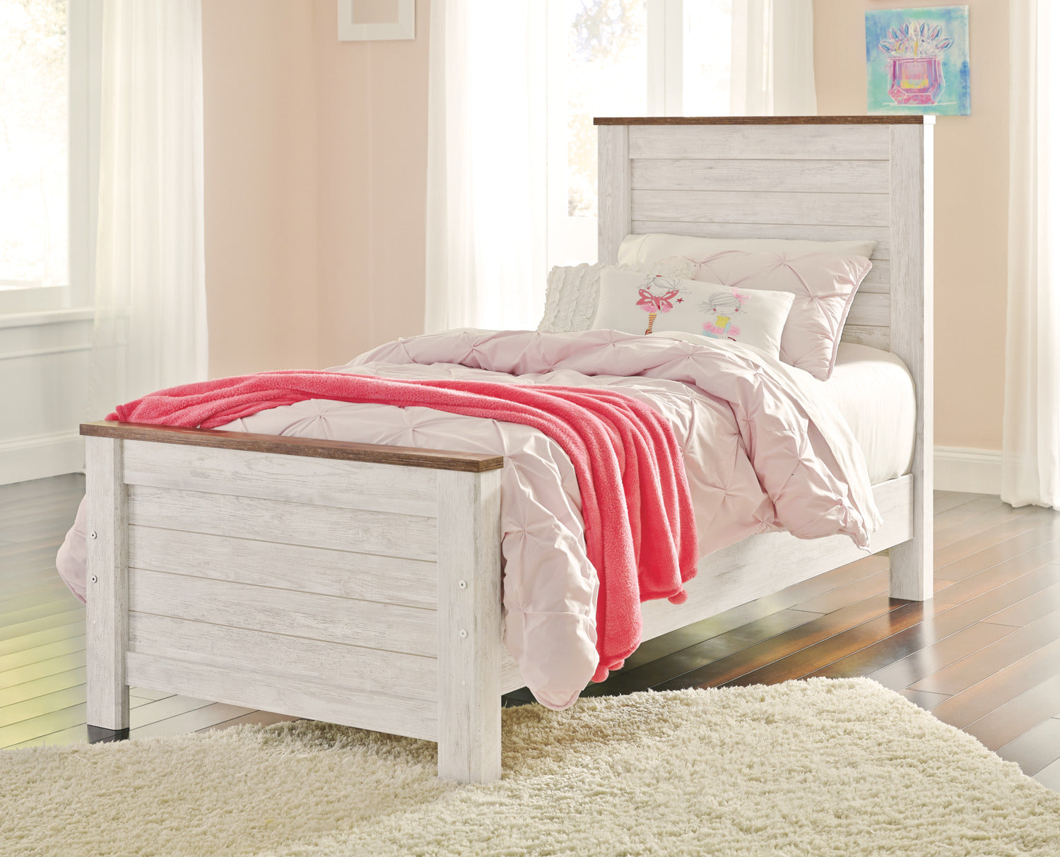 Take a trip to cottage country with this Willowton twin bed. That slowed-down, small town feeling is beautifully characterized through the whitewash finish and beaded frame. Through the uneven coating and rustic planks, you'll be able to spot the unique character of the woodgrain, providing you with a quaint, familiar look that has been stylish through the ages. The matching headboard and footboard add lovely lines and a two-toned look to this simple design. Altogether, you get a stylish bed that offers you a cozy retreat at the end of each day.