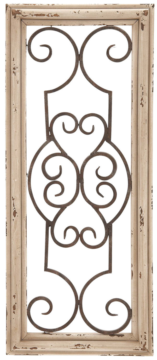 Bring some texture and historic charm to your walls with this intricate wall panel. With an antiqued, white-washed frame and wrought-iron style detailing, this piece brings shabby-chic or cottage couture into your home. The simple rectangular shape, beautifully offset by the intricately-patterned metal detailing creates a mix of textures and shapes that truly pleases the eye.
