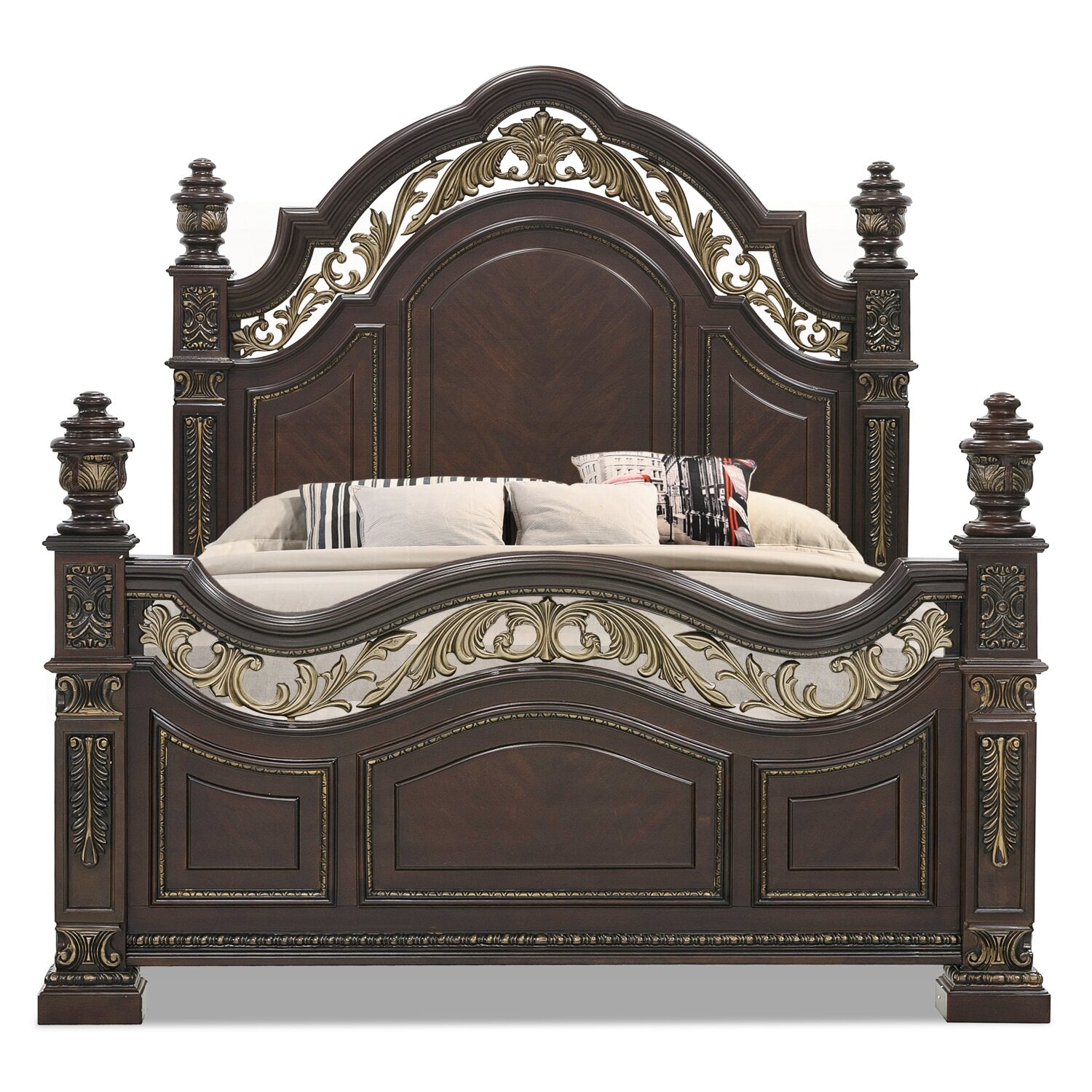 | Accent Details | Traditional floral carvings outline the bed, while metal scrollwork sits above the headboard and footboard for an Old World feel. |
