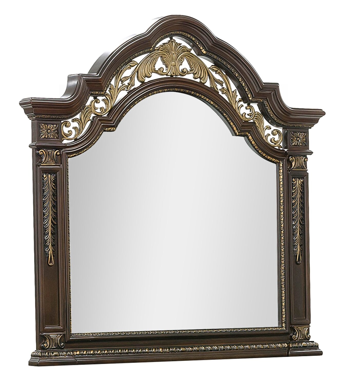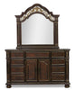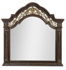 | Accent Details | Traditional floral carvings outline the mirror, while metal scrollwork sits above the glass for an Old World feel. |