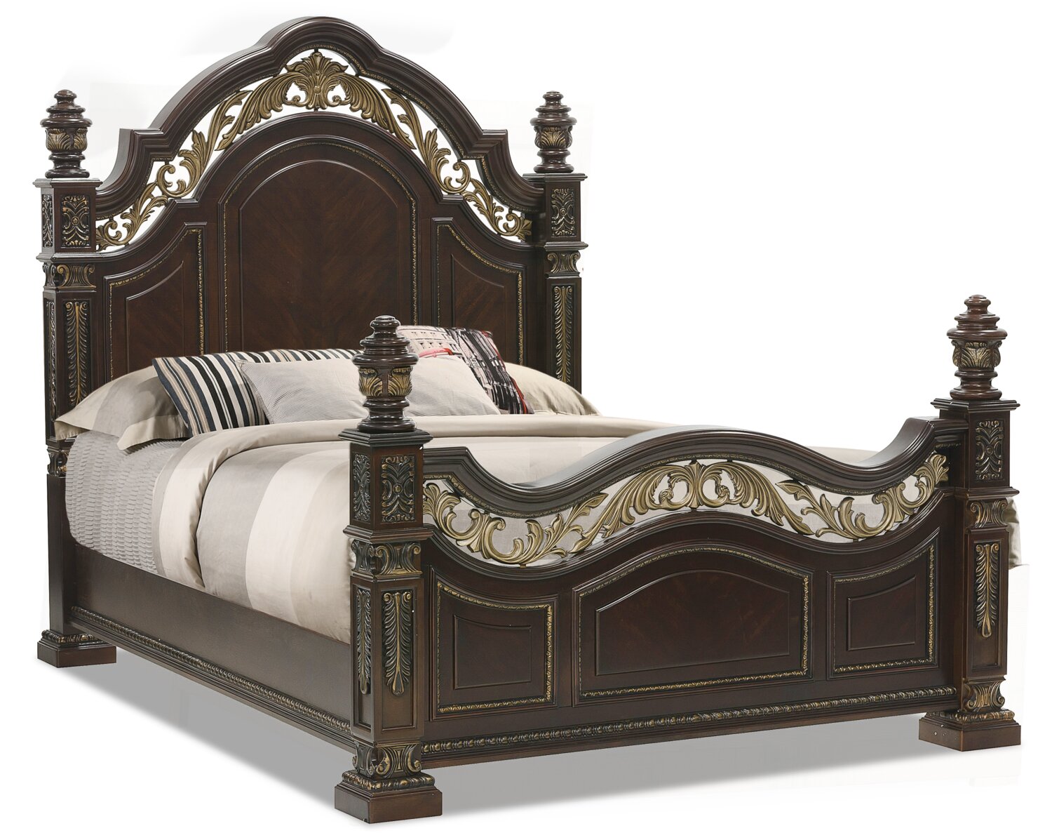 | Accent Details | Traditional floral carvings outline the bed, while metal scrollwork sits above the headboard and footboard for an Old World feel. |