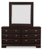 Embrace the feeling of contemporary style with the Yorkdale brown queen five-piece storage bedroom package. The soft brown finish made from engineered wood creates a neutral base to pair perfectly with almost any room decor. Six drawers built into the lower half of the bed help you keep extra blankets or pyjamas close at hand. Rectangular pewter drawer pulls and a large square mirror add a burst of sparkle to the ample amount of storage space. Let the sleek, modern design of the Yorkdale brown bedroom help you build the perfect space for rest and relaxation.