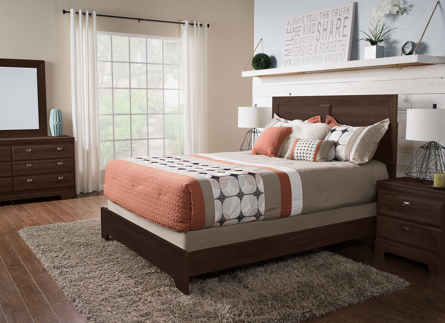 Simply modern, the Yorkdale embodies style in every aspect of the furniture. The rich dark saddle birch finish will augment any existing bedroom décor, and the sleek pewter hardware enhances the style and appeal of this contemporary collection. All the drawers are dust proof, keeping your case goods cleaner longer! This package includes a queen bed, dresser, mirror and a nightstand - add the chest to complete the set!