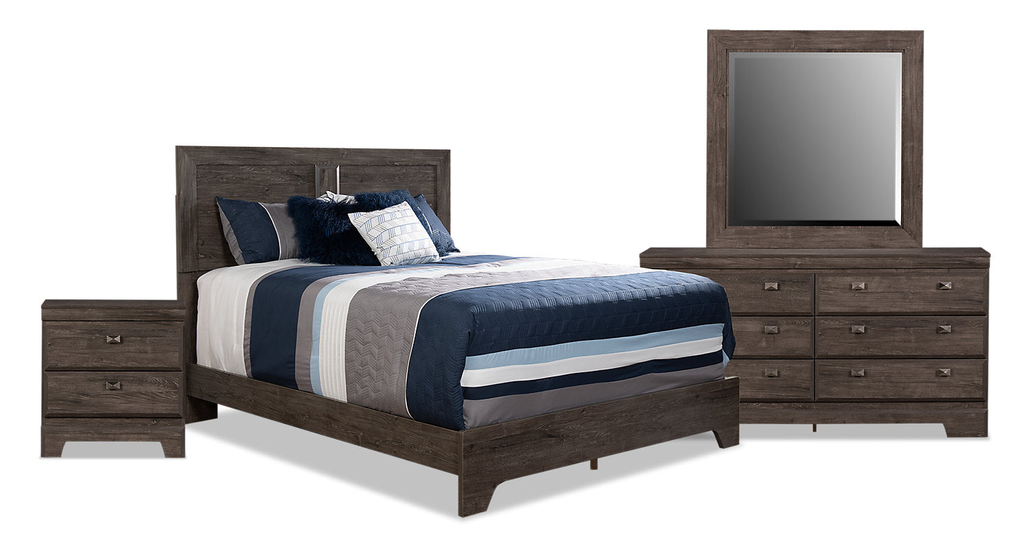 Embrace the feeling of contemporary style with the Yorkdale grey queen six-piece bedroom package. The soft grey finish made from engineered alabaster oak wood creates a neutral base to perfectly pair with almost any room decor. A sleek, tall headboard features a simple two-panel design that lets the natural look of the wood shine through. Rectangular pewter drawer pulls and a large square mirror add a burst of sparkle to the ample amount of storage space. Let the sleek, modern design of the Yorkdale grey bedroom help you build the perfect space for rest and relaxation.