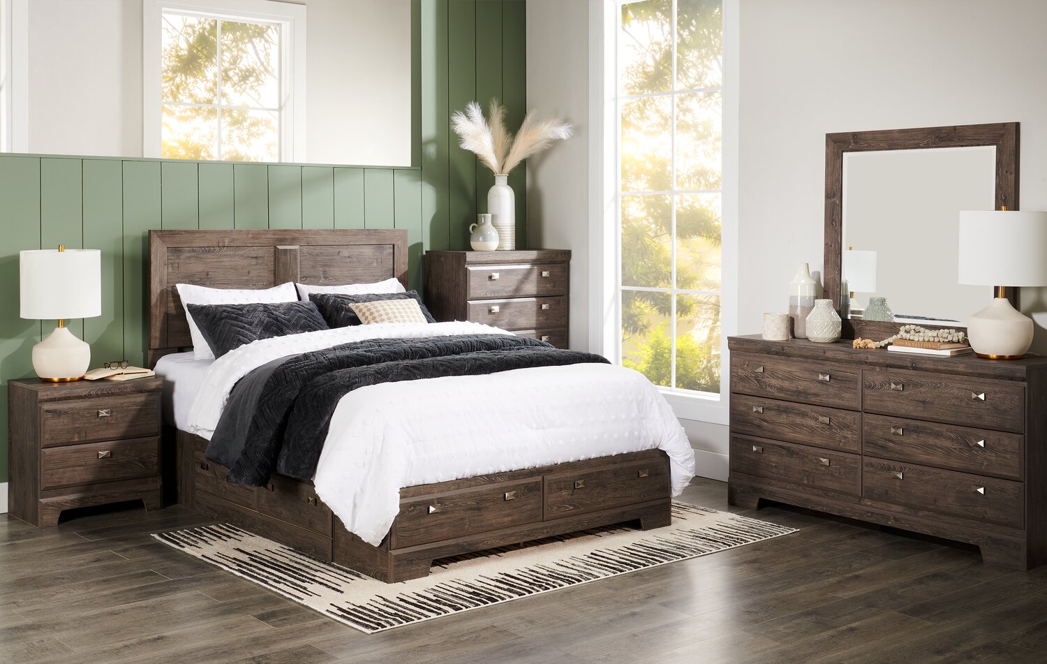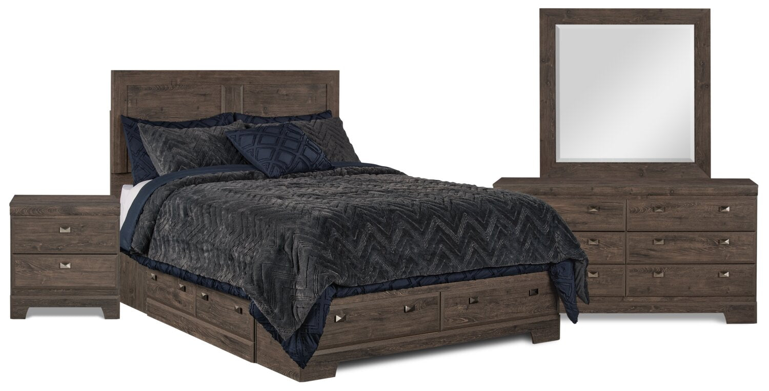 Embrace the feeling of contemporary style with the Yorkdale grey queen six-piece storage bedroom package. The soft grey finish made from engineered wood creates a neutral base to pair perfectly with almost any room decor. Six drawers built into the lower half of the bed help you keep extra blankets or pyjamas close at hand. Rectangular pewter drawer pulls and a large square mirror add a burst of sparkle to the ample amount of storage space. Let the sleek, modern design of the Yorkdale grey bedroom help you build the perfect space for rest and relaxation.