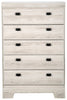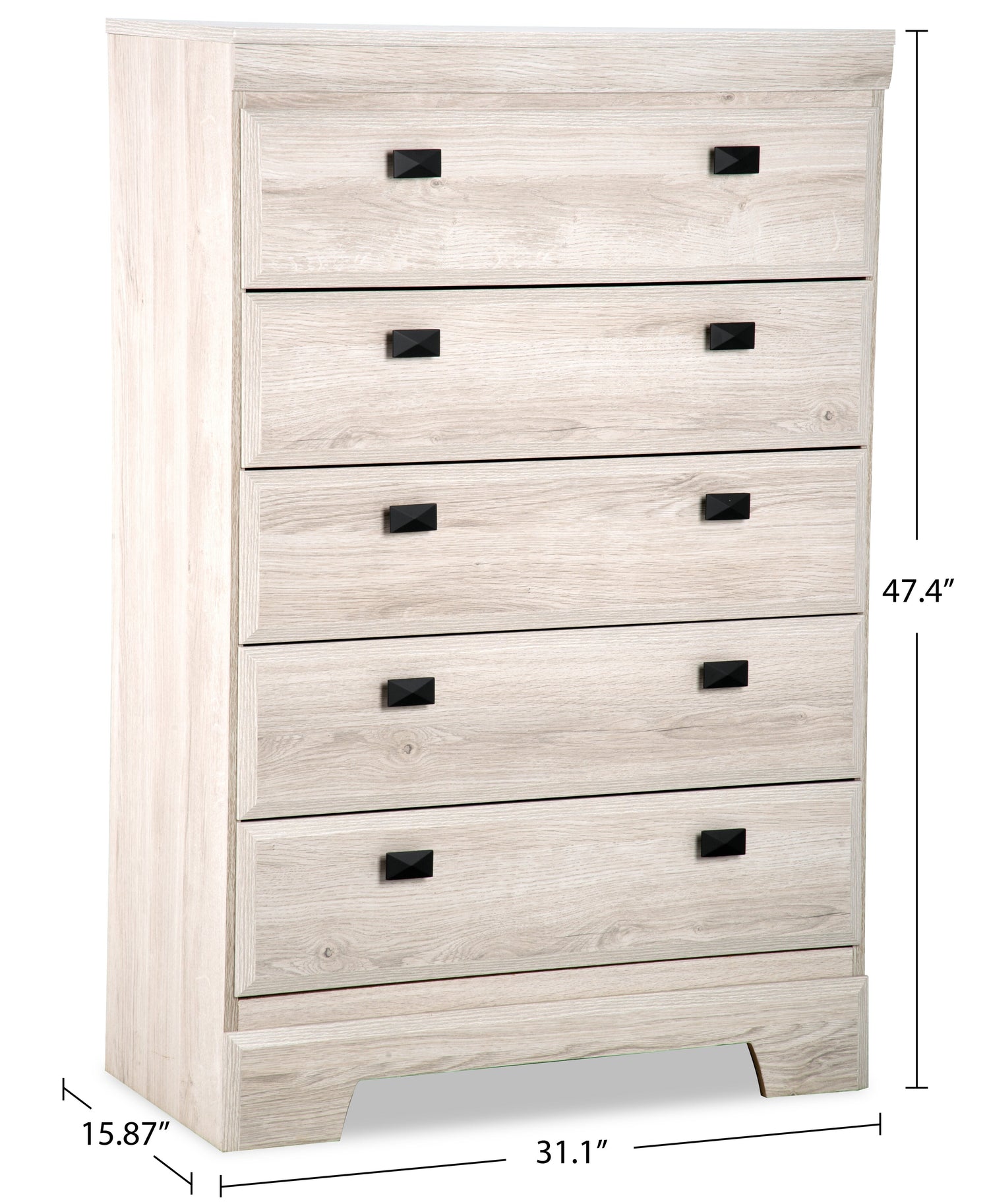 Embrace the feeling of contemporary style with the Yorkdale white chest. A white finish made from engineered wood creates a neutral base to pair perfectly with almost any room decor. Rectangular pewter handles decorate the front of the drawers and adds a metallic contrast to the light finish colour. Let the sleek, modern design of the Yorkdale wight chest help you build the perfect space for rest and relaxation.