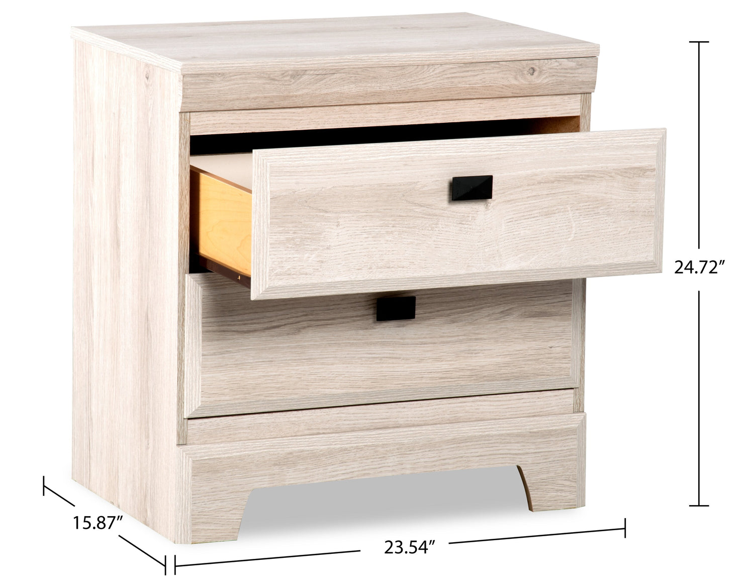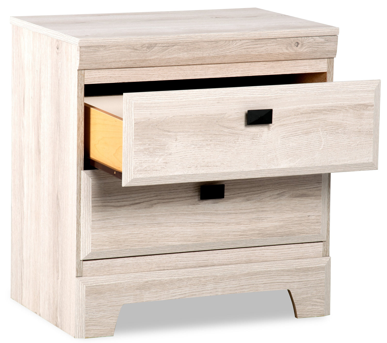 Embrace the feeling of contemporary style with the Yorkdale white nightstand. A soft birch finish made from engineered wood creates a neutral base to pair perfectly with almost any room decor. Rectangular pewter handles decorate the front of the drawers and adds a metallic contrast to the light finish colour. Let the sleek, modern design of the Yorkdale wight nightstand help you build the perfect space for rest and relaxation.