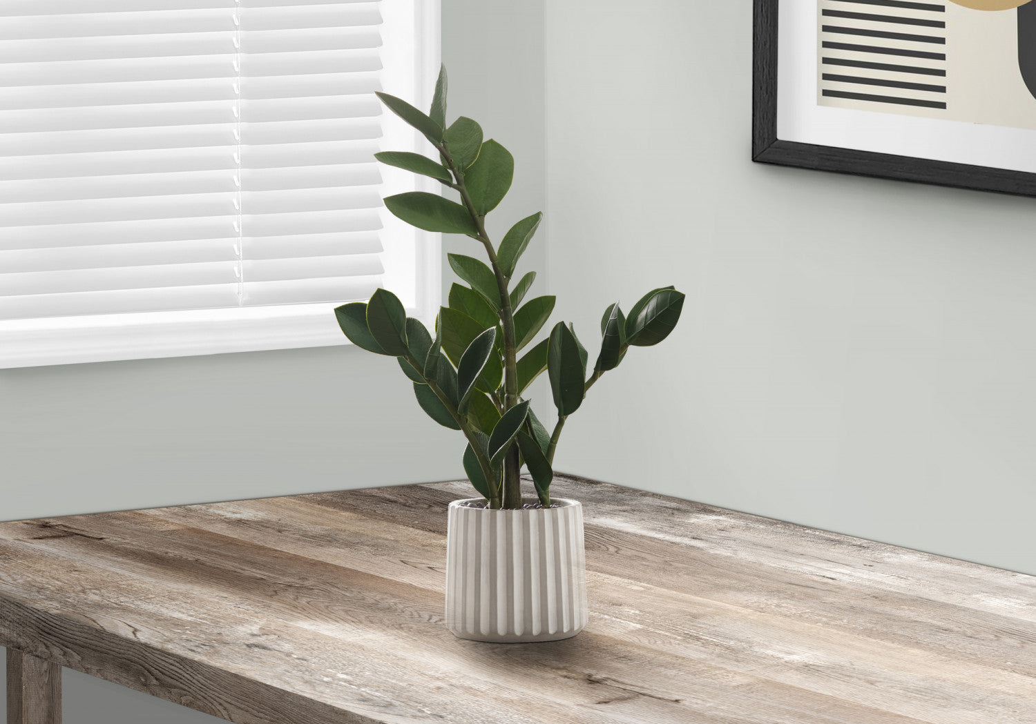 Twenty-inch tall indoor artificial ZZ Plant in a five-inch grey cement pot adds a vibrant burst of greenery to your home or office. Thirty-two real-touch, adjustable green leaves create a lifelike appearance. This easy-care faux potted plant is made from the highest quality materials and requires no maintenance or watering for a sustainable, environmentally friendly decorative accent that will last a lifetime.